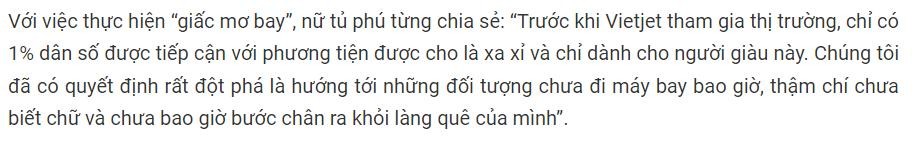 她创办了越捷航空(Vietjet),成为越捷航空的CEO和最大股东,越捷航空的目标乘客是越捷航空的目标乘客是那些从未搭乘过飞机,甚至不识字,从未踏出家乡的人,航空以低成本的模式发展。