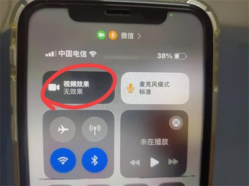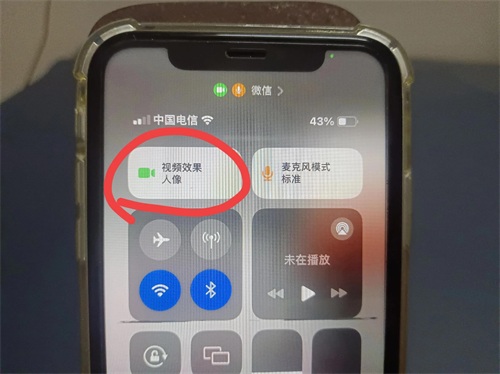 按住手机顶部右上角向下滑,在控制中心就能看到有一个微信视频效果,此时显示的是人像,点进去(如上图所示)