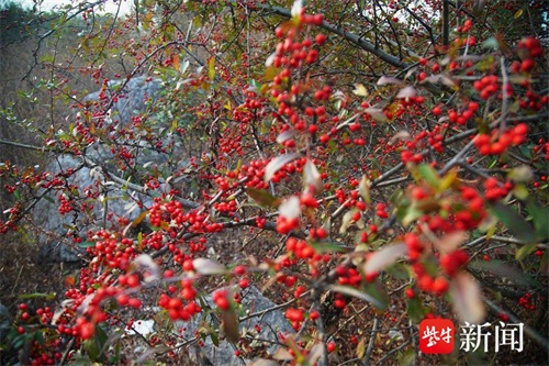 扬子晚报网12月31日讯(通讯员 武家敏 记者 梅建明)初冬百叶凋零,美丽的花朵逐渐谢去,悄然成熟的果子开始“接棒”,坠满枝头。眼下,在南京幕府山的山坡上,一片又一片的火棘果很是惹眼,红红的果实挂满树枝,犹如点燃冬天里的一把火。
