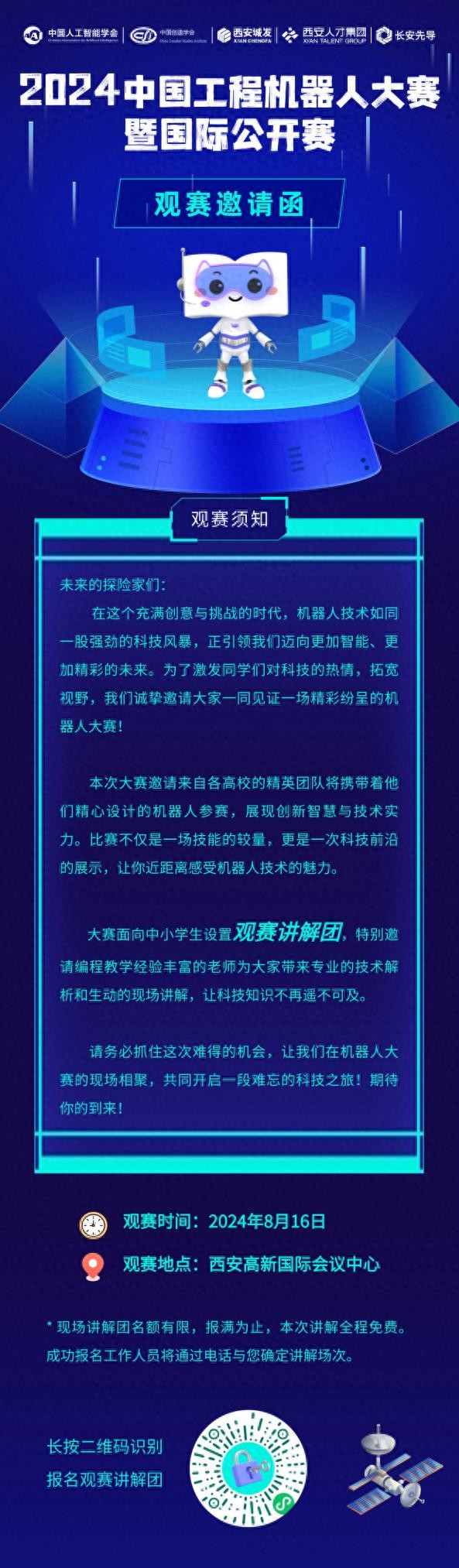 8月15日-8月16日,以“人工智能,创造未来”为主题的2024中国工程机器人大赛暨国际公开赛即将在西安高新国际会议中心举办。