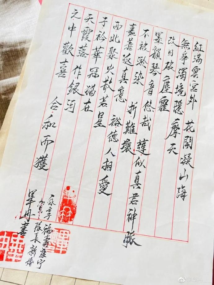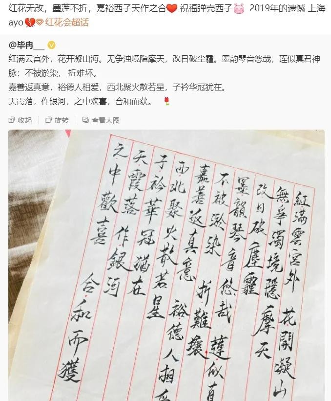 不过毕冉曾经有一件事情令人印象深刻,那就是在2019年弹壳大婚时,内秀的毕冉曾经晒出自己送给队长的“墨宝”,是一封“藏头信”,将所有句首的关键字连起来,可以得到“红花无改,墨莲不折;嘉裕西子,天作之合”这句对于团队和队长的祝福。从这个赠礼不难看出,毕冉对弹壳是相当敬重的。