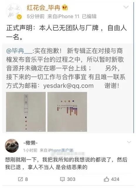 红花会解散近一年后的2020年7月31日,红花会成员毕冉突然在微博宣布退队。其实这个说法有些不太严谨,因为严格意义上已经没有红花会这个团队了,那自然也不存在退队。显然,解散只是对外的说法,团队内部依旧正常运营着。