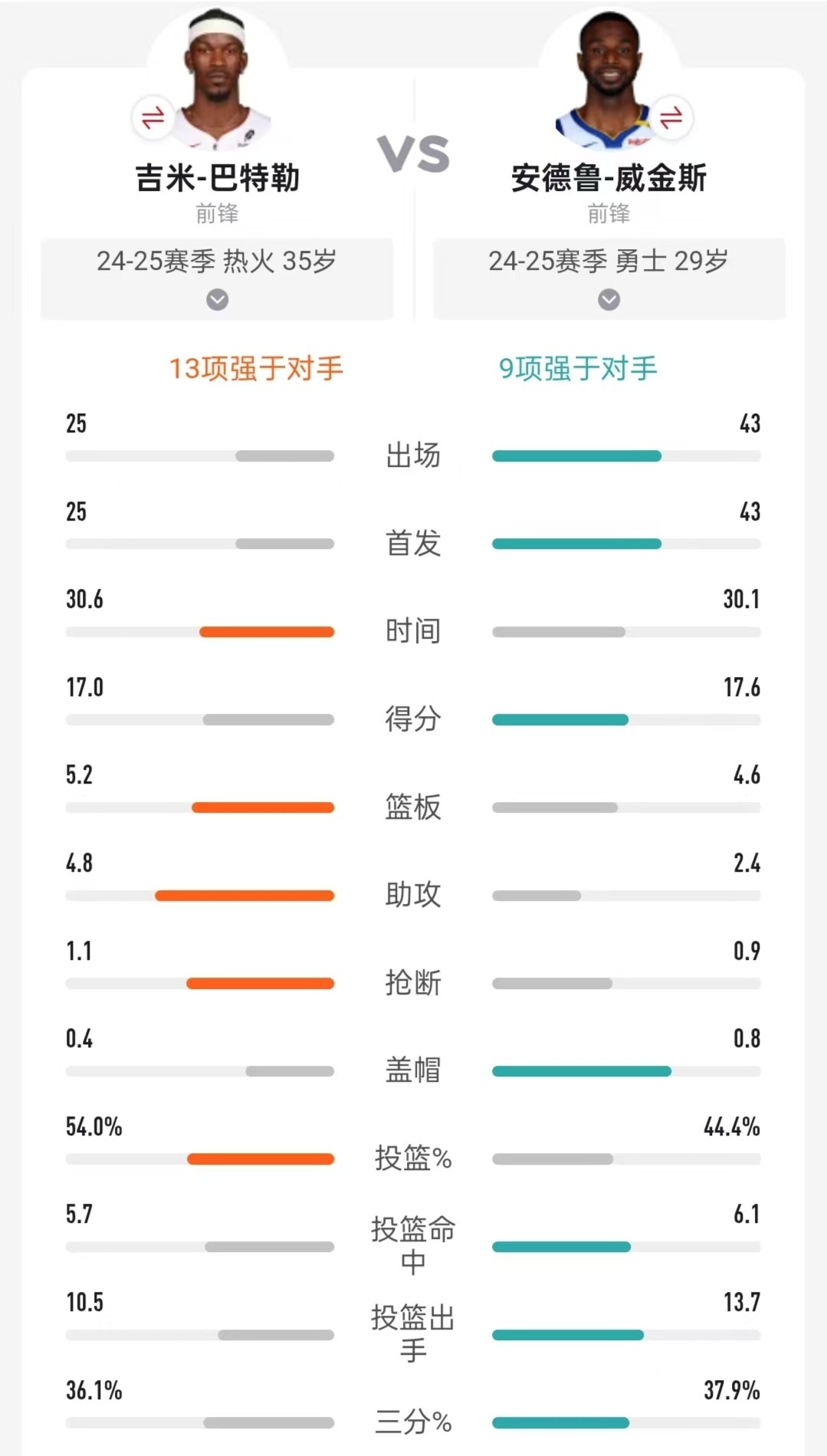 维金斯场均17.6分4.6板2.4助,巴特勒17.0分5.2板4.8助,而前者可是年轻了整整六岁!