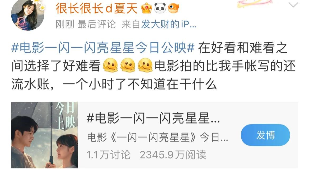 结果紧接着热度,播出的电影《一闪一闪亮星星》却效果不佳,被很多人吐槽难看,是在消耗亮星星的热度!