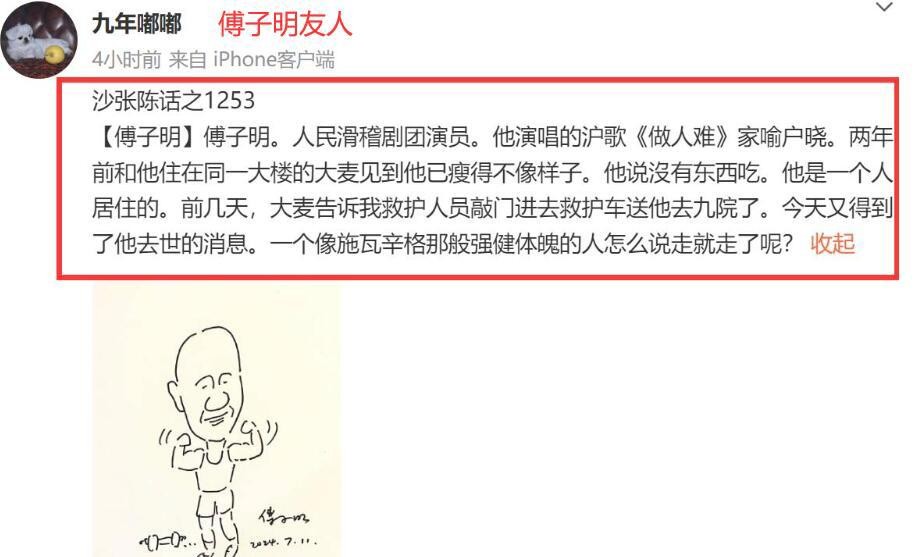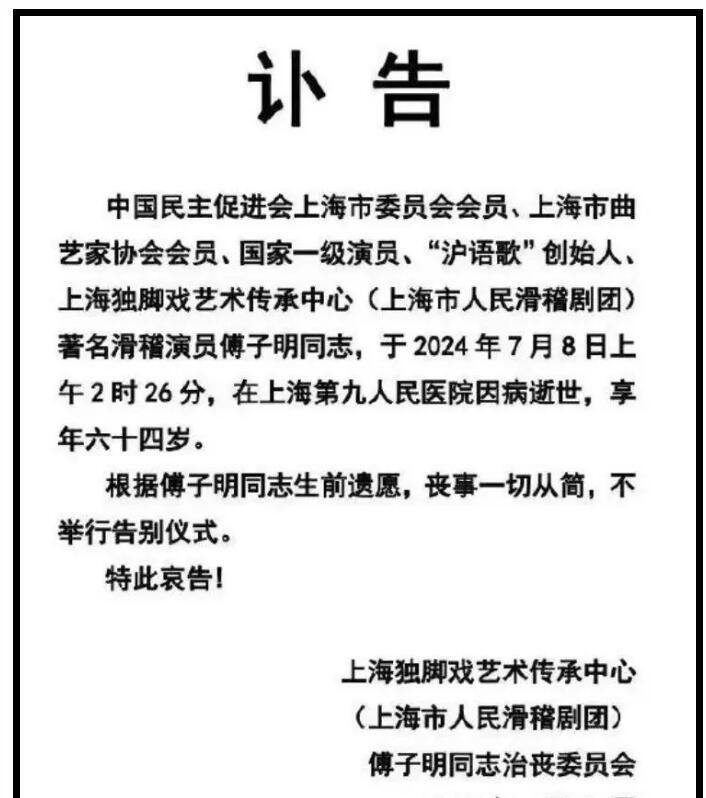 哎呦喂,这消息来得也太突然了!上海滑稽戏演员傅子明,就是那个唱《做人难》的,居然说走就走了。7月8日凌晨2点,在上海第九人民医院,我们的笑星永远闭上了眼睛。