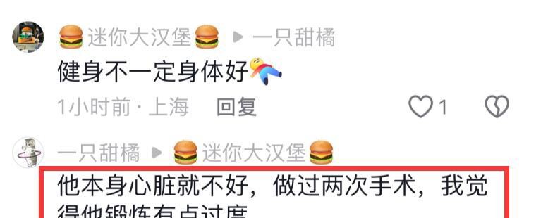 傅子明其实早就做过两次心脏手术了。这么看来,他的健身可能有点过头了。再加上他还爱抽烟喝酒,这对一个心脏病患者来说,可真是要命的组合。