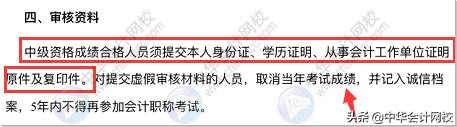 中级资格成绩合格人员须提交本人身份证、学历证明、从事会计工作单位证明原件及复印件。对提交虚假审核材料的人员,取消当年考试成绩,并记入诚信档案,5年内不得再参加会计职称考试。