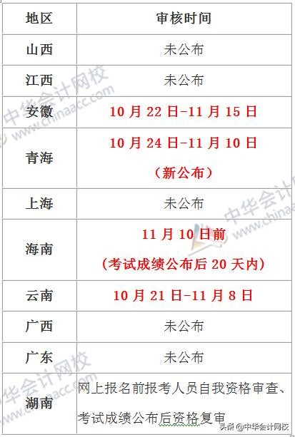 目前,考后审核的地区有:山西、江西、安徽、青海、上海、海南、云南、广西、广东。其中,安徽、青海、海南、云南地区均已发布审核通知,公布审核时间,请考生抓紧!