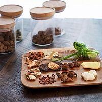 1、7g花椒、3g八角、4g丁香、5片香叶、5g甘草、4g桂皮、6g陈皮混合,用纱布装好做成两个调料包。