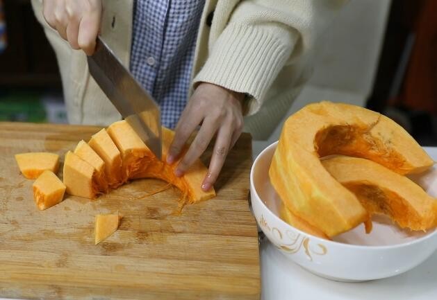 1、南瓜削皮之后切大块备用。