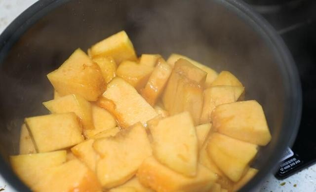 4、南瓜翻炒均匀之后,直接盛到电饭煲里面。