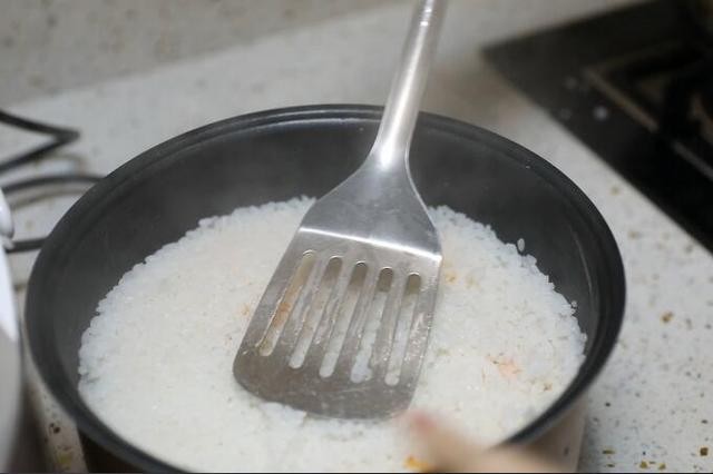 2、大米掏干净,冷水下锅。大米烧开之后,揭开锅盖,防止汽水冒出来,不时用铲子搅动一下,防止糊锅。