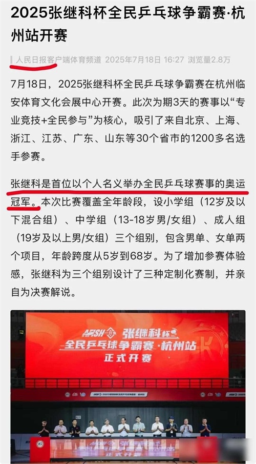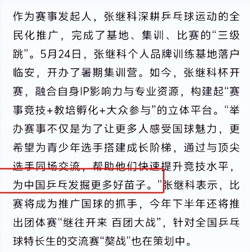 那篇文章里提到:张继科是首位以个人名义举办全民乒乓球赛事的奥运冠军。