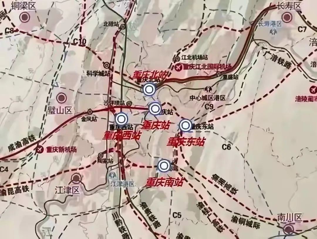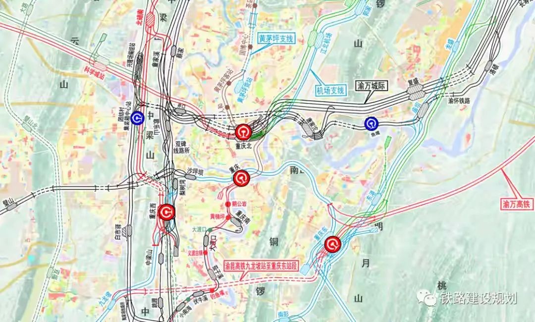 与此同时,未来还规划了菜园坝火车站至重庆北站枢纽联络线,与枢纽东环线机场支线相连。