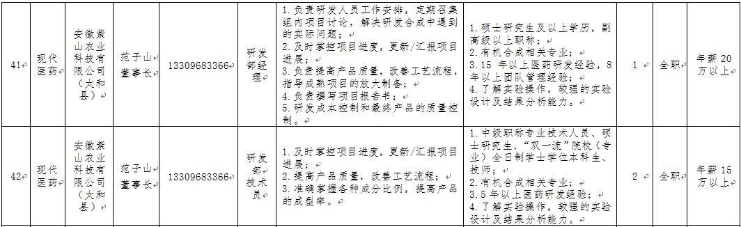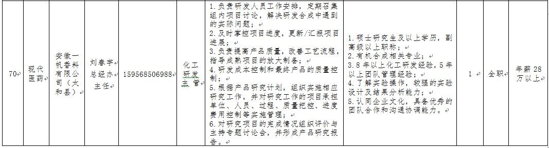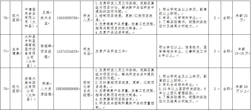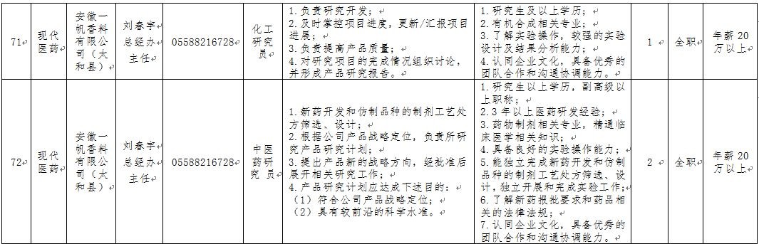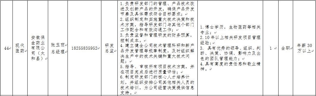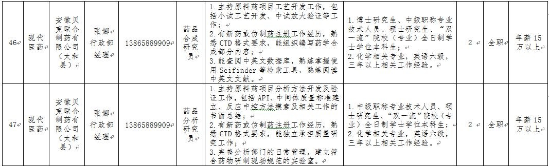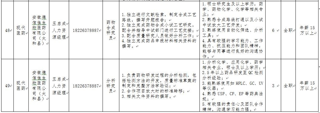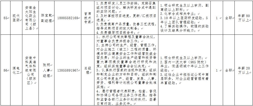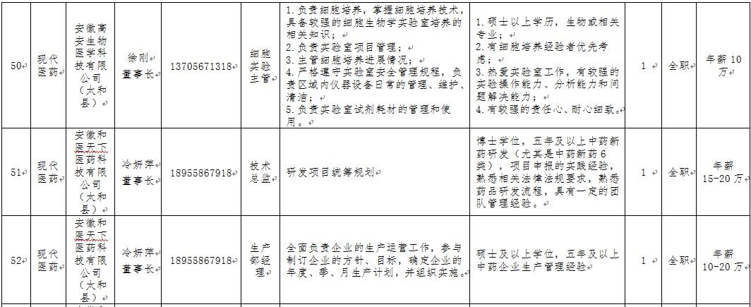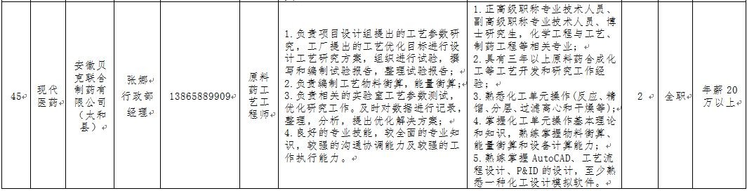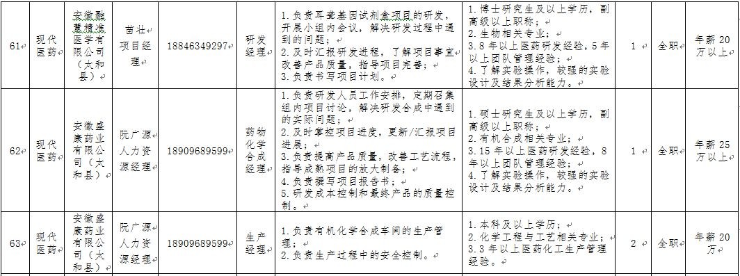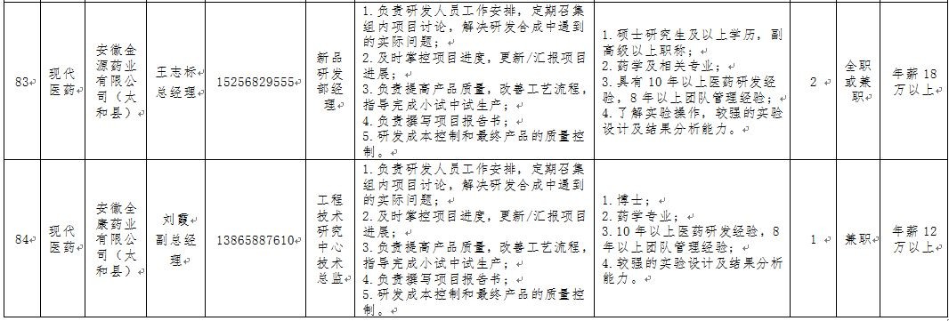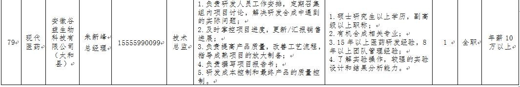其中,位于颍上县的金太阳生化药业有限公司发布的首席技术专家岗位薪资颇具吸引力,任职要求需要具备硕士研究生及以上学历、副高级以上职称,化学合成相关专业,10年以上医药研发经验、5年以上团队管理经验等,岗位职责包括研发人员工作安排,定期召集组内项目讨论,解决研发合成中遇到的实际问题;及时掌控项目进度,更新、汇报项目进展;负责提高产品质量,改善工艺流程,指导成熟项目的放大制备等,年薪可达到80万元以上。