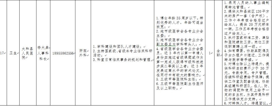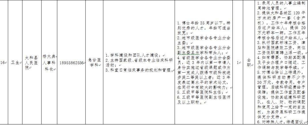 太和县人民医院本次需要引才5人,涉及急诊医学科、肝胆外科等多个科室,本次所录用人员不仅纳入事业编制周转池管理,还提供太和县城区120平方米的房产一套(工作十年考核合格后过户给本人),提供20万元轿车一辆(工作五年考核合格后过户给本人)。