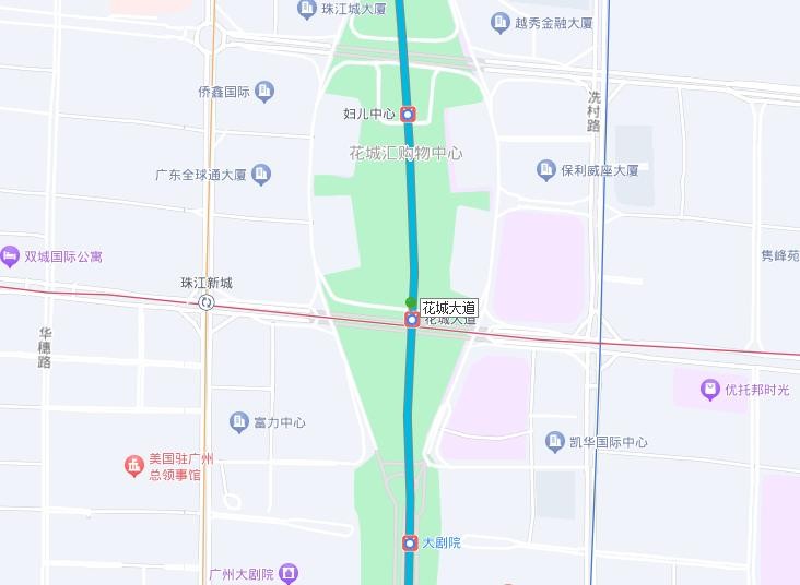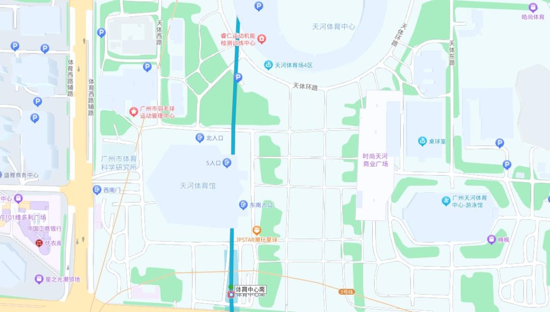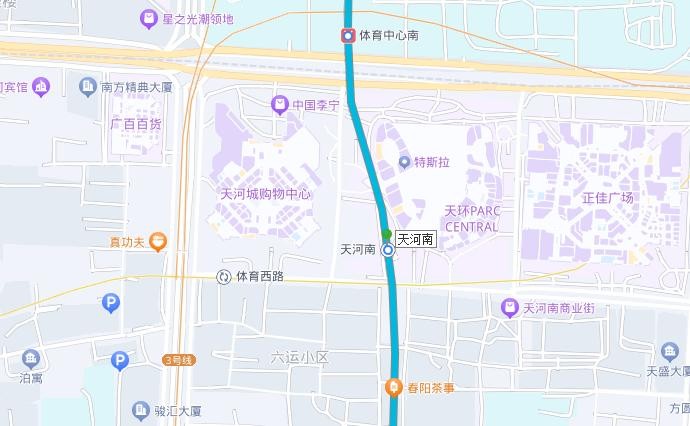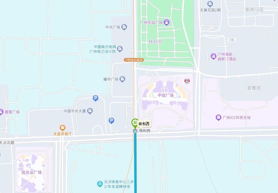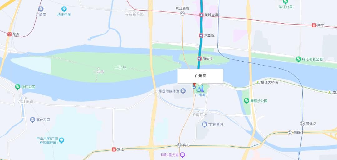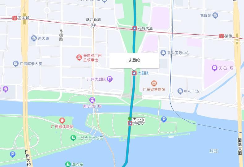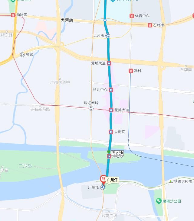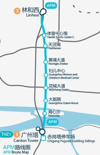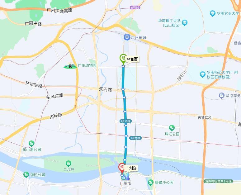 广州APM线南起海珠区的广州塔,向北下穿珠江主航道到达海心沙,再经过珠江新城花城广场中轴线,经过天河体育中心到达林和西站。