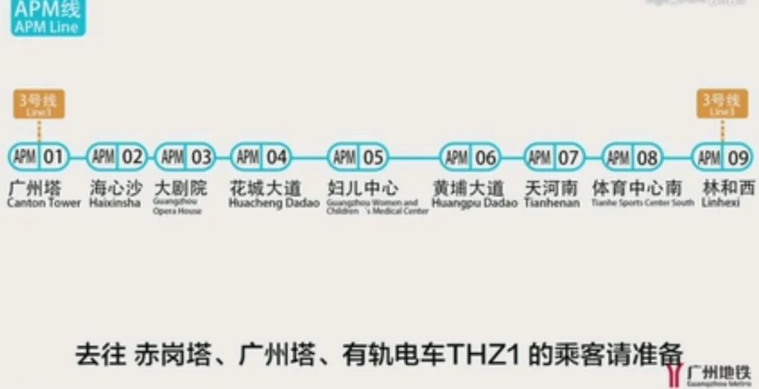 广州地铁APM线全长4公里设9座车站,南起广州塔,北到林和西站