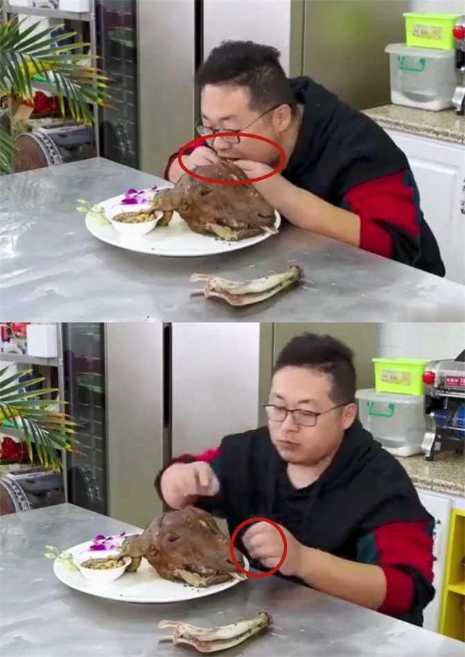 第二条视频则是在吃羊舌,羊舌上的肉特别禁食,一般买来都是切片吃的,而半吨则直接撕下来一块,然后低下头直接啃,同样是只啃了一口,就直接扔到了脚底的垃圾桶。