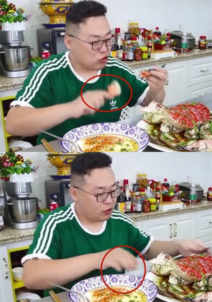第一条视频是半吨在吃帝王蟹,只见他拿起一块大的蟹肉,吃了一口就把手放到了桌子下面,随后便听到“咚”的一声,剩下的蟹肉都被他扔进了垃圾桶里。