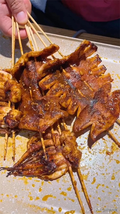 鱿鱼就不用解释了,烧烤必备!无论是铁板烧还是碳烤,鱿鱼都是必不可缺的食材,烤串的时候,一只鱿鱼可以整只烤,也经常会被分成几个部位各烤各的。如鱿鱼爪、鱿鱼嘴、鱿鱼板、鱿鱼头等不同部位,鲜美脆爽、口感各异。作为烤鱿鱼来说,并不是越大的鱿鱼越好,太大的鱿鱼肉质老硬并不鲜美,以中等大小的鱿鱼为佳。