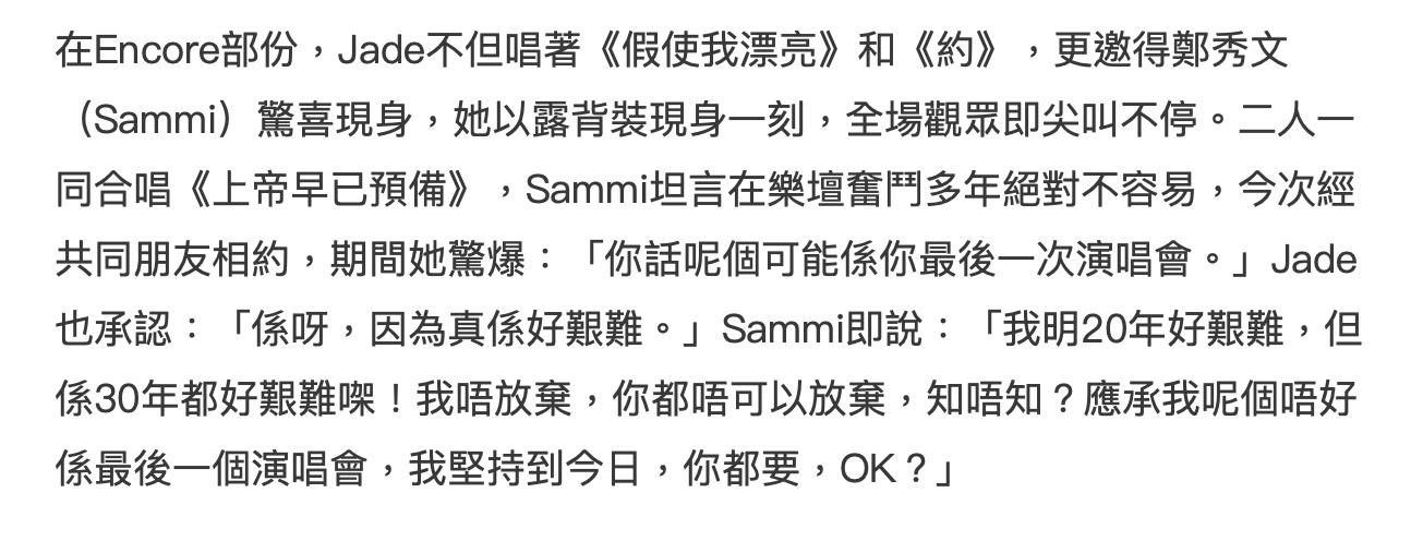 现年42岁的香港歌手关心妍在香港红馆举办了两场名为《关心妍Jade Kwan约20周年演唱会》。6月5日是演唱会的最后一场,关心妍使尽了浑身解数,为尾场演唱会带来了精彩的表演,除了固定嘉宾萧正楠如期登场之外,在演唱会结束之前,她又请出了当晚的压轴嘉宾郑秀文,引爆了全场。关心妍在演出中坦言,这次演唱会可能是自己歌手生涯中的最后一次演唱会,所以她不遗余力,希望不要再留下遗憾,把能唱的歌,该唱的歌都唱了,把想请来的嘉宾也都请到了台上,如今也是圆满了。
