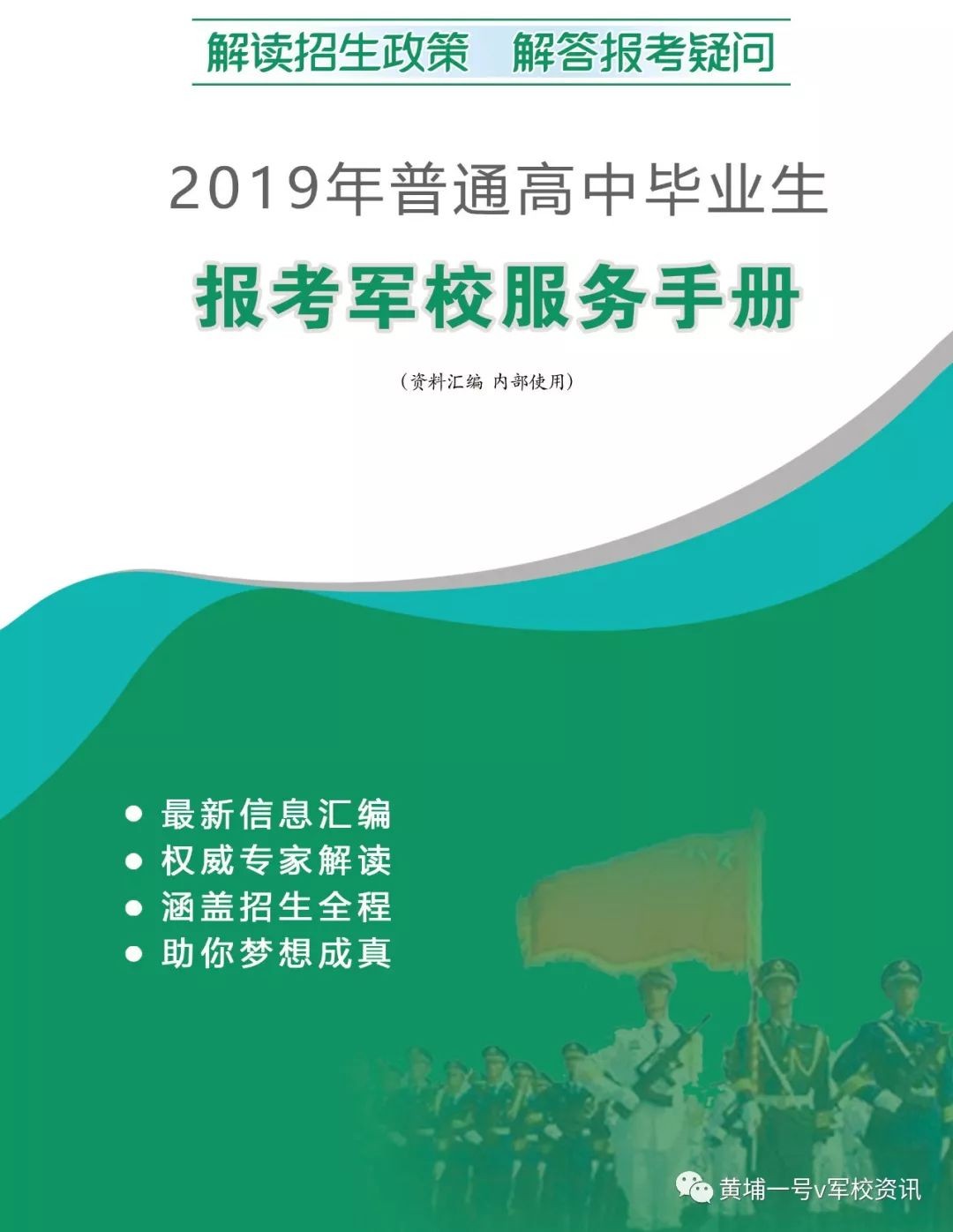 《2019高中生报考军校服务手册》正在加紧编修,内含军校报考流程、志愿填报方法、体检政审要求和注意事项、19年军校招生计划(待定)、院校和专业代码、军队院校往年录取分数线、军校入学指南、毕业分配政策等报考指导信息。由于19年招生计划还未确定,2019新版手册稍后才能发布。届时会通过“黄埔一号v军校资讯”发布信息。