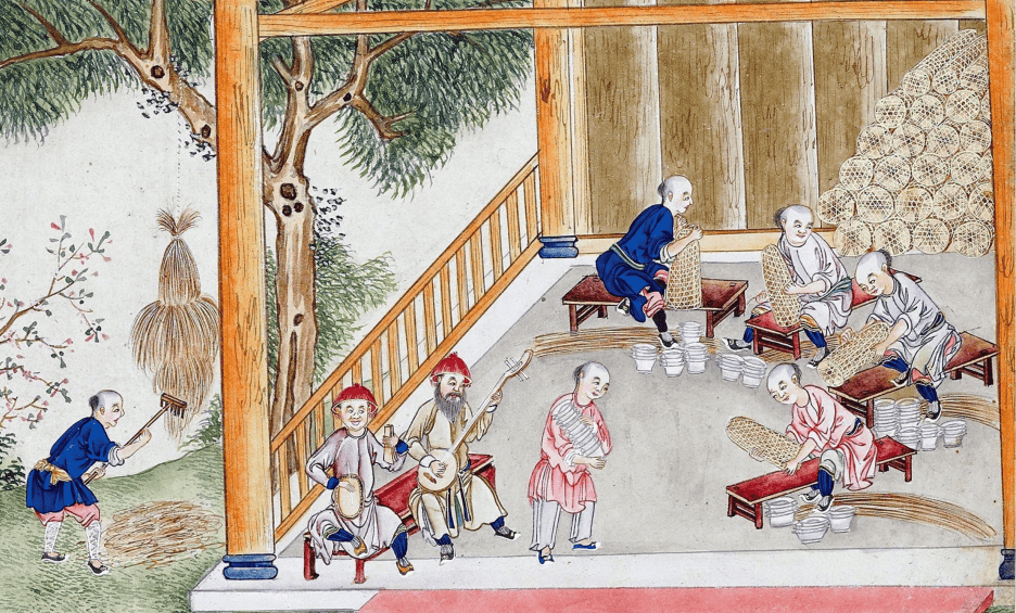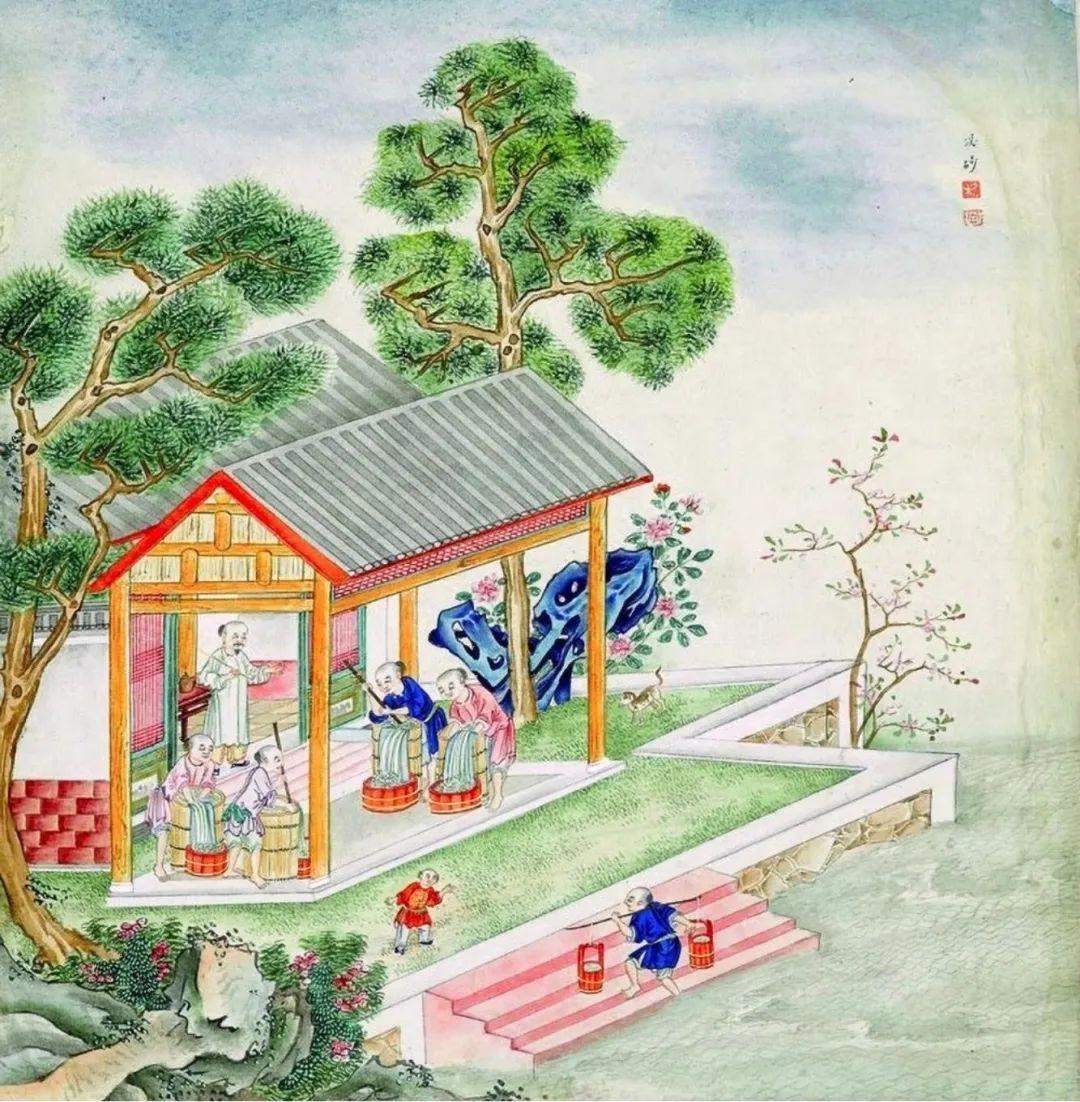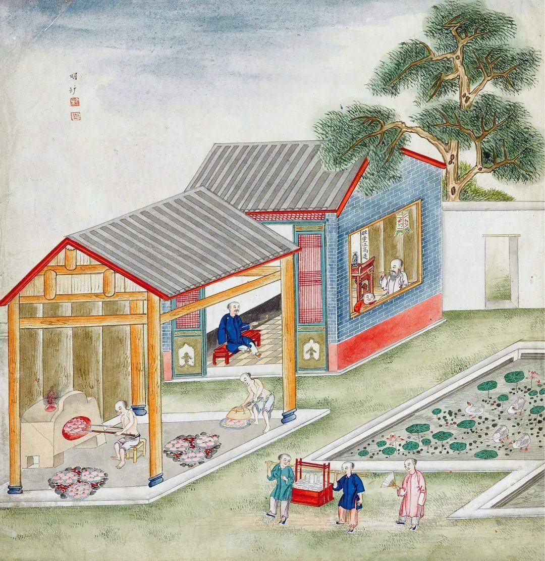 一般来说,清代工匠会用到几种上釉方法。一种是握住瓷胎圈足,将瓷坯浸入装满釉料的缸中,这是蘸釉法,也就是本图中所展现的画面。