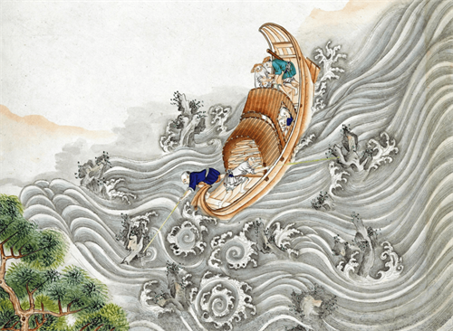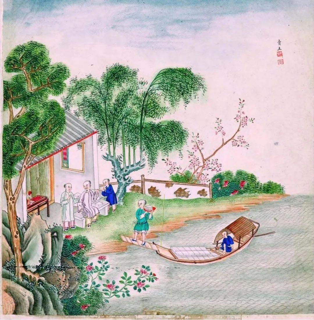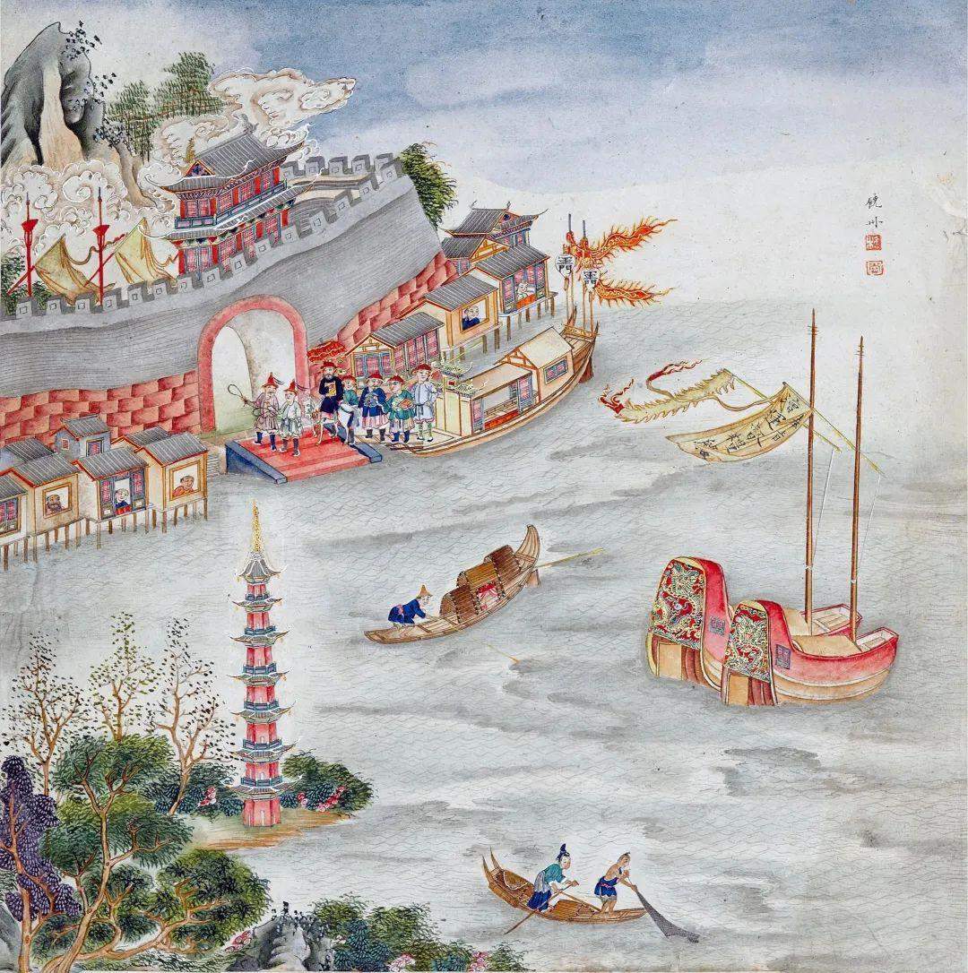 此图中右边小船杆上悬挂黄旗,隐约可见其上字样:奉旨漕运督粮船。