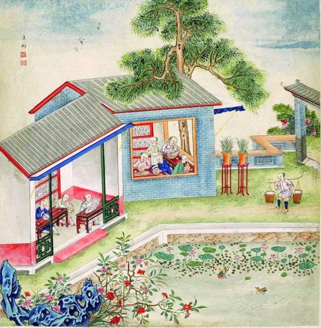 下图中可以看到明显的西洋人和富丽堂皇的珐琅彩瓷器店,店铺内甚至还有栩栩如生的鸡、犬、宝塔摆件,店铺上方还悬挂着牌匾“肯来”。