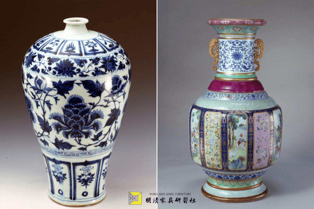 左:元 景德镇窑青花缠枝牡丹纹瓶 上海博物馆藏 右:清乾隆 “瓷母”(各种釉彩大瓶) 故宫博物院藏