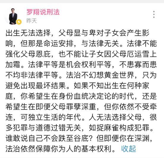 他认为“罪责自负,无罪不罚”。出生无法选择,限制罪犯子女考公,违背公平原则。