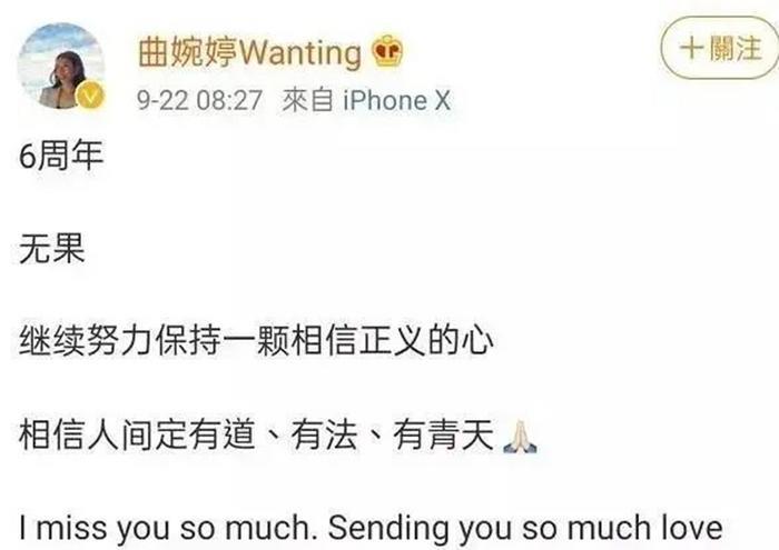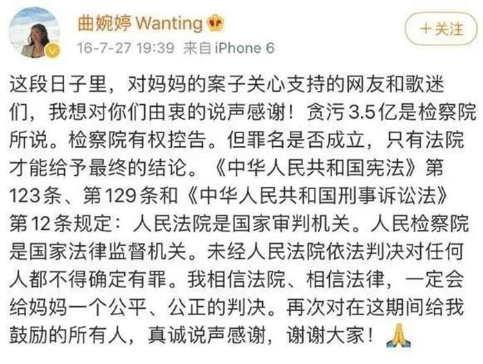 “孝顺”的曲婉婷9年了,没有回国探监,没有找律师辩护,没有为母亲的自由奔走,她只敢躲在国外,花着蘸着血的钱,每年发条微博为母亲例行叫冤。