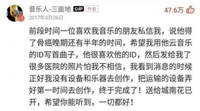 这是一个真实感人的故事,网易云音乐ID城南花开是一个骨癌晚期的少年,他说他最喜欢的是三月,但是在2025年2月25日他离开了这个世界!他生前最喜欢的音乐人是三亩地的音乐,于是就私信给他,让三亩地以他的ID城南花开为音乐名写一首曲子,曲子完成了,少年听到了。在这个过程中,少年面对癌症的坚强和永不放弃的精神也感动了无数网易人的心。