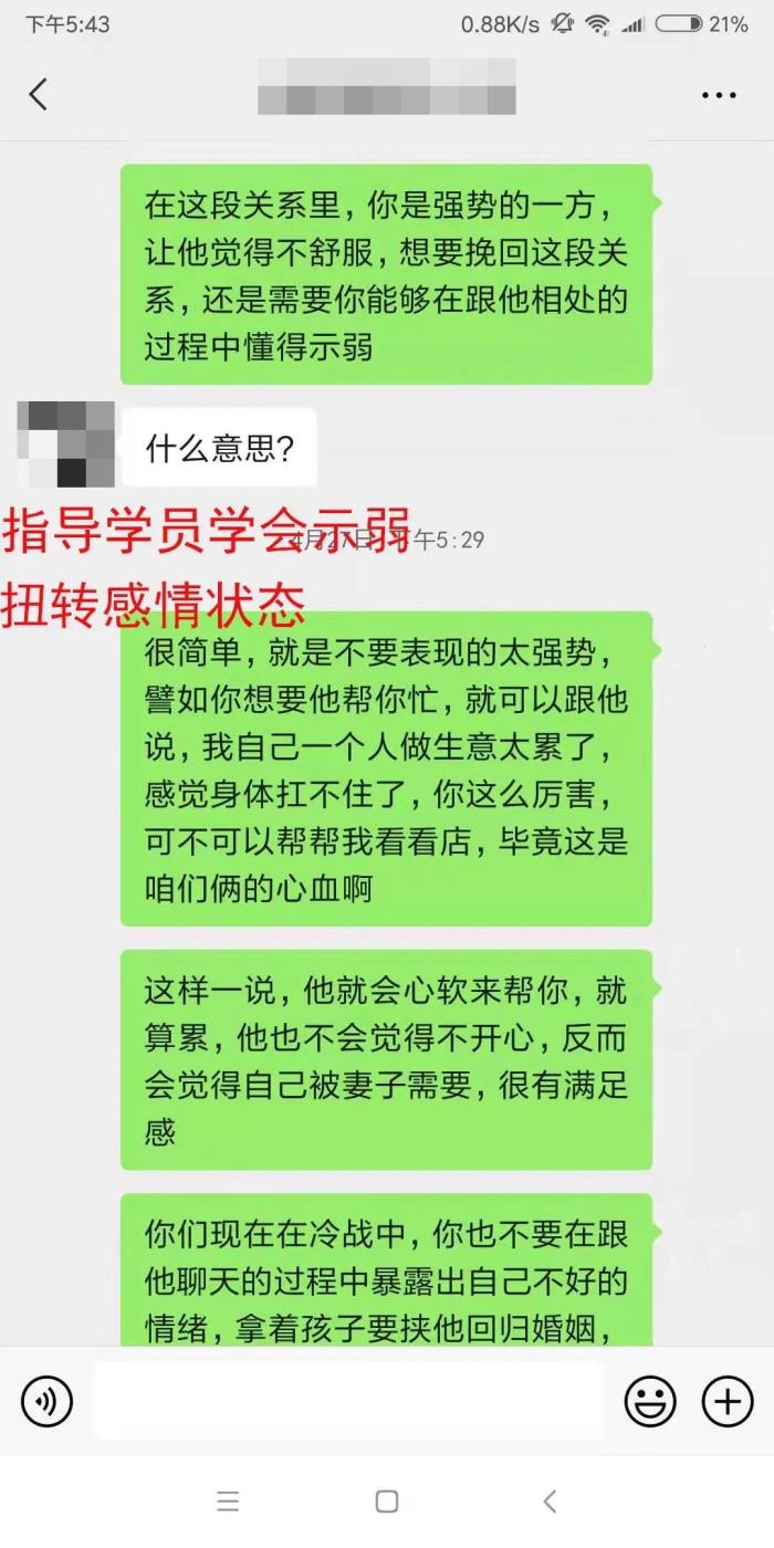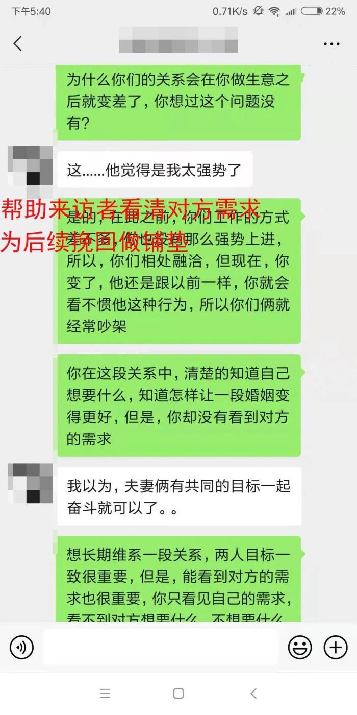 在跟对方恢复联系之后,为了避免来访者跟目标的关系又陷入之前的僵局中,老师指导来访者在一开始先减少跟目标的沟通,跟老师一起学习示弱、夸奖等等能给对方提供情绪价值的技巧。