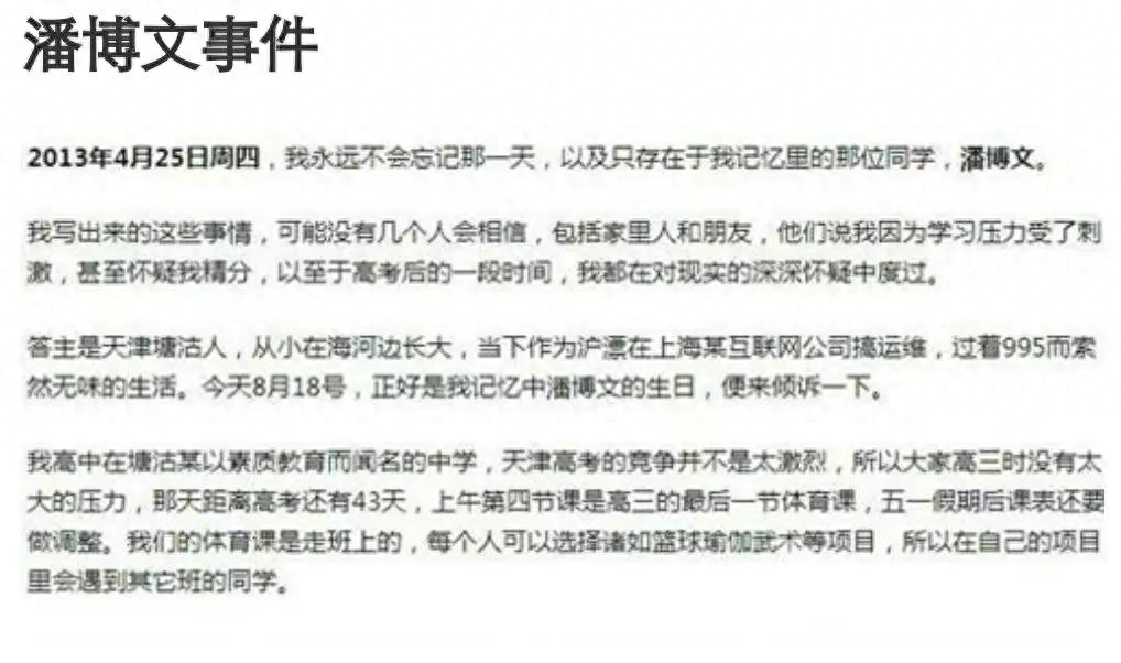 在2013年4月25号这一天,距离高考还有43天,在天津塘沽的一所高中里啊,读高三的A和他的同学在上体育课,这也是高三的最后一节体育课,这所高中的体育课是按照项目上会有不同班级的人在一起上课,A当时选的项目是羽毛球,上课的时候,A就和同班同学小温打球,刚开始他们在小路上打,打了一会儿觉得太阳晒,就转到宿舍楼前面去,到了那里发现,已经有人在那里打球了,也不是别人,就是这个故事的关键人物潘博文,潘博文是A的初中同学,因为两个人都是英语课代表,所以。成人的关系还算不错,升到高中之后呢,他们也在同一所学校,只是班级不同,潘博文被分到了十班,而这时和潘博文对打的就是同样来自十班的同学L君,这个L君也是个主要人物,简单的聊了几句之后啊,两组人就各自打球,打了一会儿,A的同学小温就提出要换对手啊,因为他觉得A的手劲太大,就这样换成了A和潘博文对打,打着打着,一个不小心,羽毛球就被打到了墙角,而这个墙角的地方刚好有一个地下室的换气口,这一看就是那种比较老的建筑特色了。