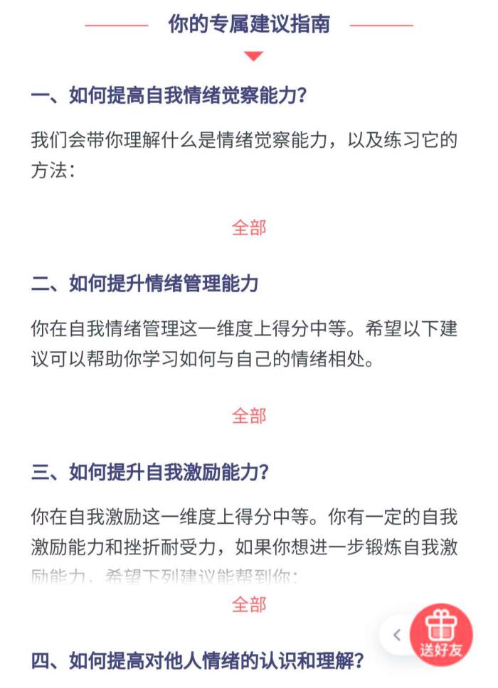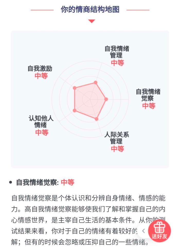 为了帮助你更好地了解自己,我们开发了情商测试,让你从自我情绪觉察、认识他人情绪、自我情绪管理、自我激励和人际关系管理5个维度了解自己的情绪智力。同时也会根据你的情况,提供专属的成长指南,帮助你提升和锻炼自己。