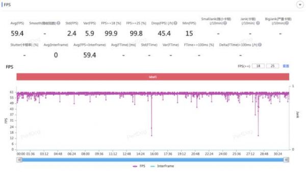 看来《王者荣耀》的测试强度过于「亲民」了,于是我们加大测试的强度,直接上30分钟中画质+60帧模式的《原神》须弥城帧率测试,测得平均帧率59.4,中间除了战斗释放技能时帧率会有明显的波动外,其他情况几乎稳如直线。同时,vivoX90s的机身升温要明显一些,但依旧可以接受,不影响《原神》的游戏操作。