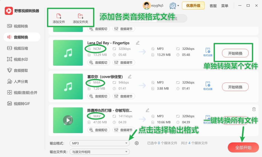 第二步:把需要进行转换的音乐文件导入软件中。在输出格式菜单里选择需要转换的格式,推荐把ncm、m4a、wav等格式转换为mp3格式(兼容性好、文件相对较小),然后设置输出路径,点击全部开始进行转换。
