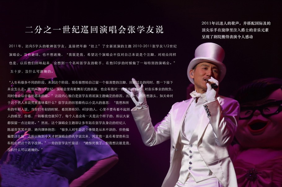 1994年,在事业重心大幅度转移到音乐上后,张学友的演唱会多了起来,因为歌迷众多,光是1995年和1996年,他就举办了100场世界巡回演唱会,总观众人数达到200万人次,张学友把演唱会当成一种艺术来演绎,他不是单纯的在现场把歌曲唱出来给歌迷听,而是尽可能融入音乐剧、舞台剧等元素来丰富演唱会的内容,高质量的张学友演唱会从不缺少人气,1997年,他参与策划、导演并主演的原创音乐剧《雪狼湖》在香港连续上演42场,创造了香港音乐剧演唱的票房纪录,不能说张学友在重新定义演唱会,但他丰富了演唱会的表现形式,提升了演唱会的艺术水准却是不争的事实。