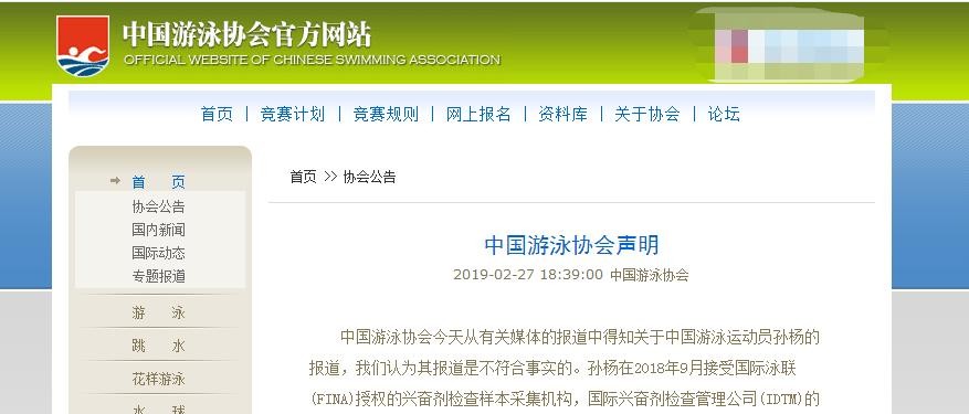 据中国游泳协会官方网站消息,27日从有关媒体的报道中得知关于中国游泳运动员孙杨的报道,我们认为其报道是不符合事实的。孙杨在2018年9月接受国际泳联(FINA)授权的兴奋剂检查样本采集机构,国际兴奋剂检查管理公司(IDTM)的赛外检查时,因IDTM的兴奋剂检查人员不能提供合法的兴奋剂检查官证件和护士执业证,违反了国际泳联反兴奋剂规则及相关国际标准,运动员认为本次检查是非法和无效的,从而导致本次检查无法完成。国际泳联就此开展调查后,中国游泳协会本着严肃认真的态度,要求孙杨积极配合调查,客观真实反应当时情况。目前,依据国际泳联反兴奋剂委员会(FINA DOPING PANEL)决定,认定运动员没有违反FINA有关反兴奋剂规则。(海外网)