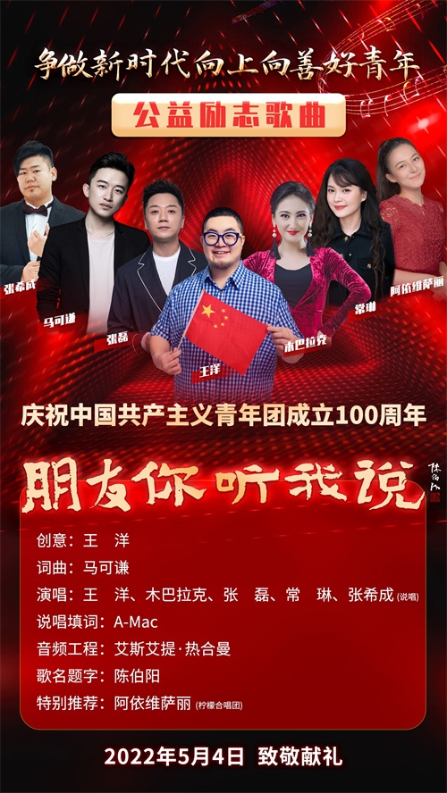 2022年,适逢中国共产主义青年团成立100周年。5月4日,在第72个中国青年节来临之际。由“新疆名片”、新疆新文艺青年群体领军人物王洋携手张磊、常琳、木巴拉克、张希成、阿依维萨丽等优秀青年文艺工作者倾情献唱,争做新时代向上向善好青年公益励志歌曲《朋友你听我说》(合唱版)MV正式上线发布。