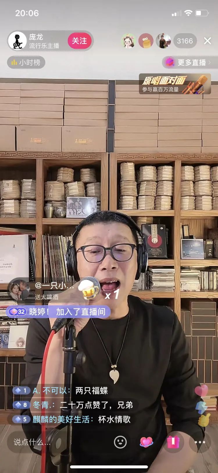 此后,庞龙在抖音开启直播常态化,一周直播4-5场,每场也有三千多名听众在直播间听歌、互动,沉寂多年的歌手找到了新的艺术舞台,再次与粉丝实现连接。