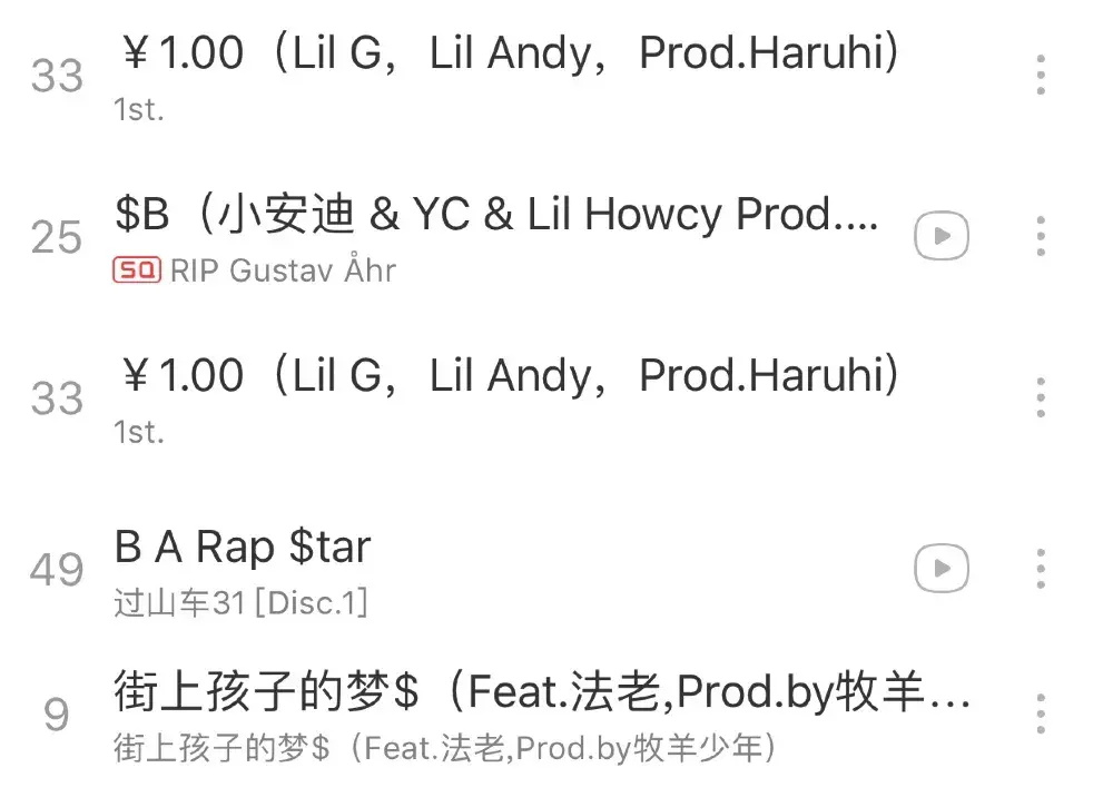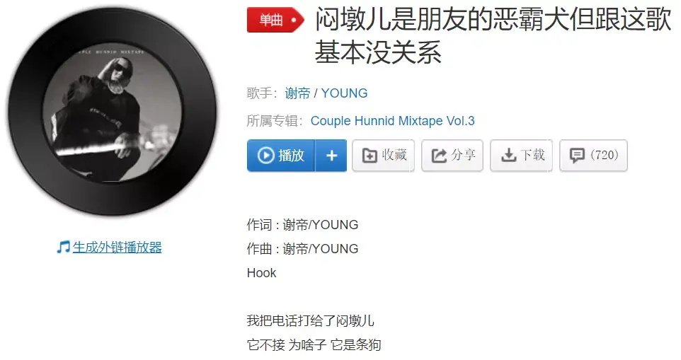 我们的谢老板,也在秀腻了韵脚和Flow之后,摇身一变成为超长歌名爱好狂《闷墩儿是朋友的恶霸犬但跟这歌基本没关系》,还有JD的《你佛他这个flow像谁尼?AABB?AABB!?》。