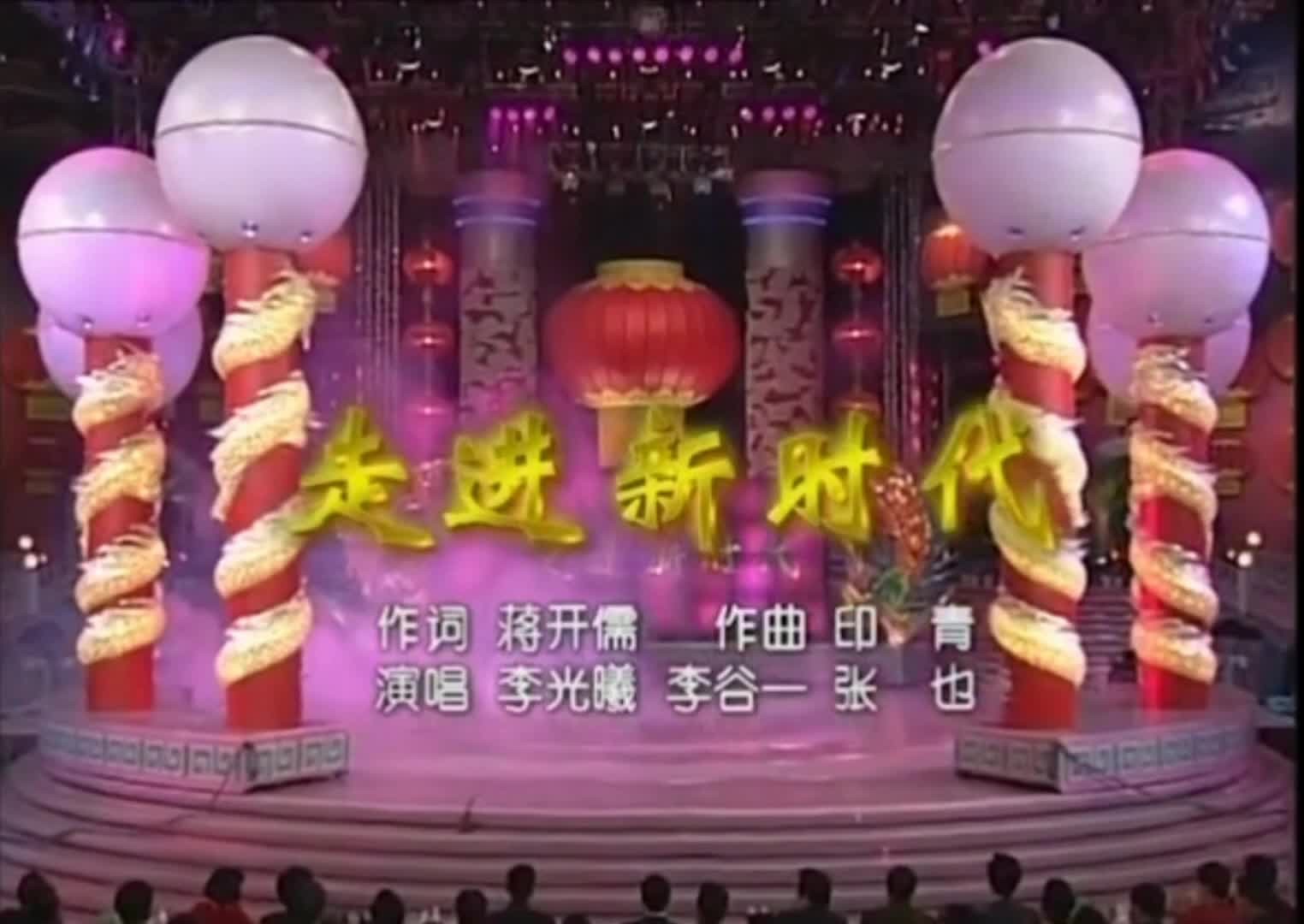 1998年春晚,李光曦、李谷一、张也合唱一曲《走进新时代》,可以说是这个主题的延续。该曲旋律动人,歌词真挚朴实,歌颂了勤劳、勇敢、智慧的中国人民,表达了对国家、对中国共产党的爱戴和尊敬之情,充满爱国主义精神。“我们唱着东方红,当家作主站起来,我们讲着春天的故事,改革开放富起来,继往开来的领路人,带领我们走进那新时代,高举旗帜开创未来”巧妙把三首爱国歌曲连接起来,唤起人们对革命战争时期、改革开放时期的回忆,并对即将走进新时代的向往和自豪。