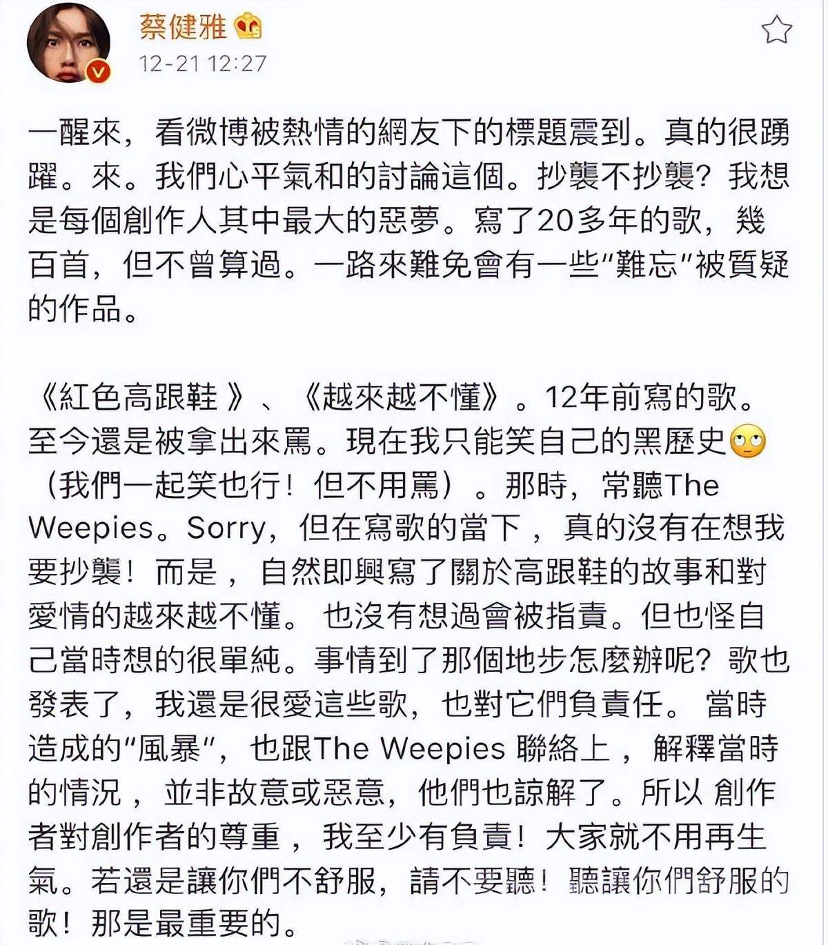 蔡健雅所属环球音乐公司,也发表声明,不认同该观点。蔡健雅本人发文发宣称:写歌20多年,成长路上难免被质疑,自己是唱听The Weepies的歌。