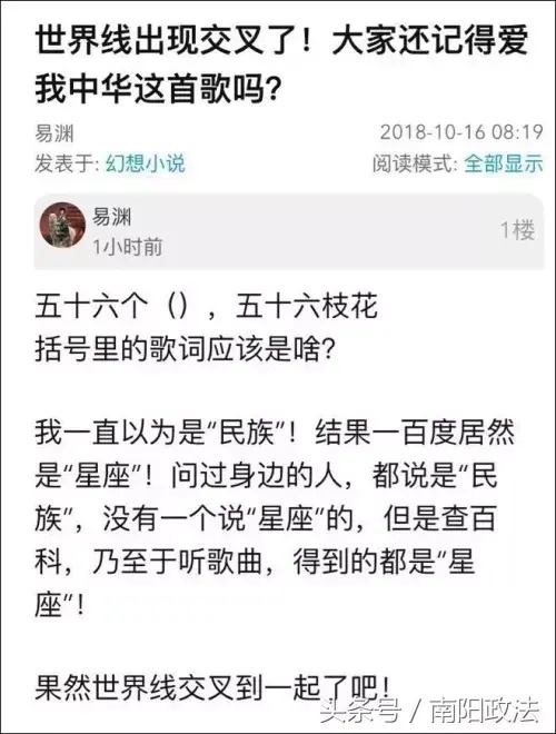 有网友发文称,自己记忆中《爱我中华》的歌词一直是“五十六个民族五十六枝花”,但是现在不知道为什么网络上的歌词全变成了“五十六个星座五十六枝花”,深深地怀疑是不是世界线出现了交叉。