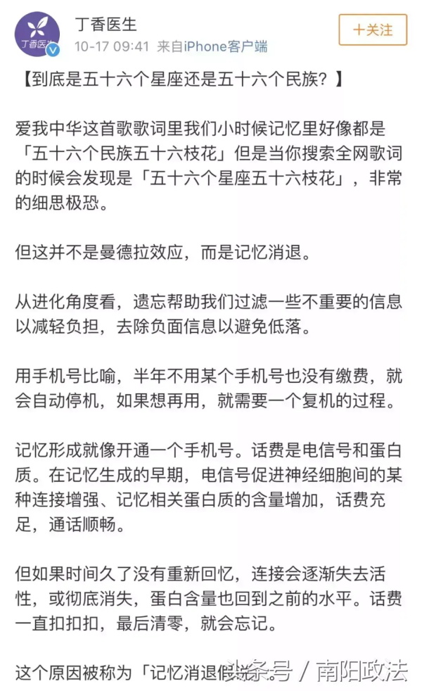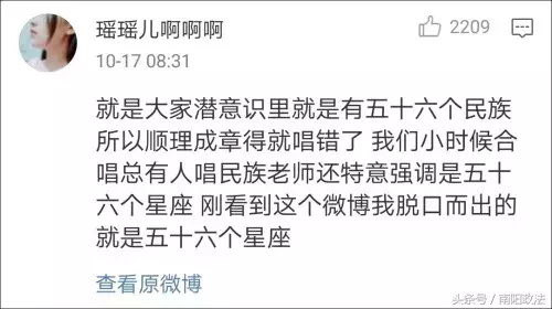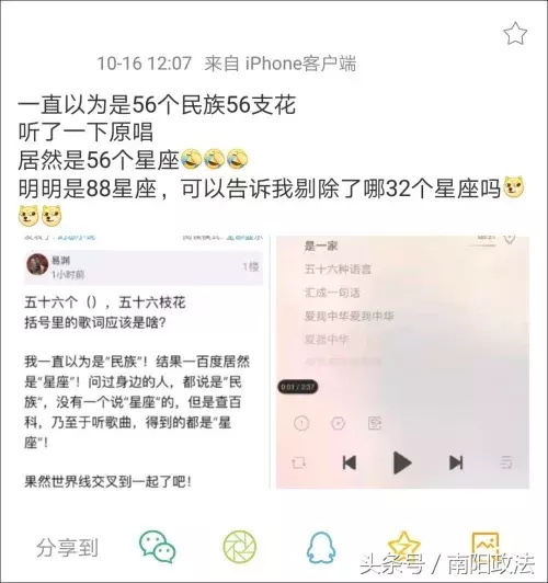 不少网友看到这个博主的发文后,也觉得自己记忆中的歌词是“五十六个民族”,但是脱口哼曲子哼出的却是“五十六个星座”。