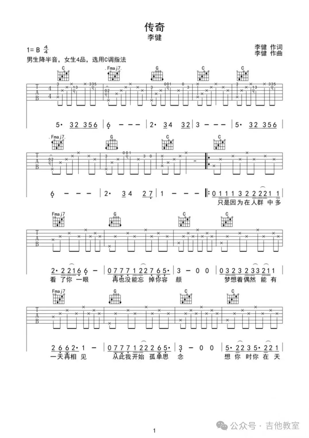 李健《传奇》吉他谱
