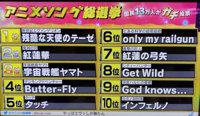 日本每年一届的“动漫歌曲总选举”于9月6日落下帷幕,朝日电视台制作特别节目揭晓了本次选举结果。荣获第一位的是高桥洋子演唱的《新世纪福音战士》的主题曲《残酷天使的行动纲领》,相信很多中国人都听过这首火了20年的动漫歌曲。本次节目公布了事前在官网上实施的问卷调查“喜欢的动漫歌曲”的结果,节目中介绍了13万日本国民从1万首以上的歌曲中选出的前20首歌曲,包括了从1960年代~2020年代的各类动漫歌曲,让大家回顾了各个时代的经典动漫。